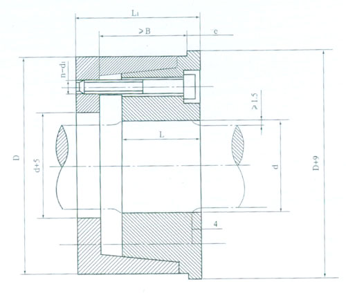 Z9 型脹套,適用于軸和軸上零件的聯(lián)結(jié),常用于帶式輸送機(jī)驅(qū)動滾筒軸與筒體的聯(lián)結(jié),其結(jié)構(gòu)形式和基本尺寸按圖和下表的規(guī)定。
